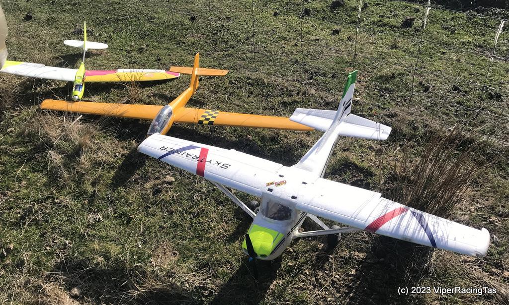 Kermit got to maiden his little Fox glider (after correctly securing the motor from last week) and after a small amount of radio tuning it flew well, He also got up some airtime with his Razor but not the SkyTrainer as it needs its luggage secured.