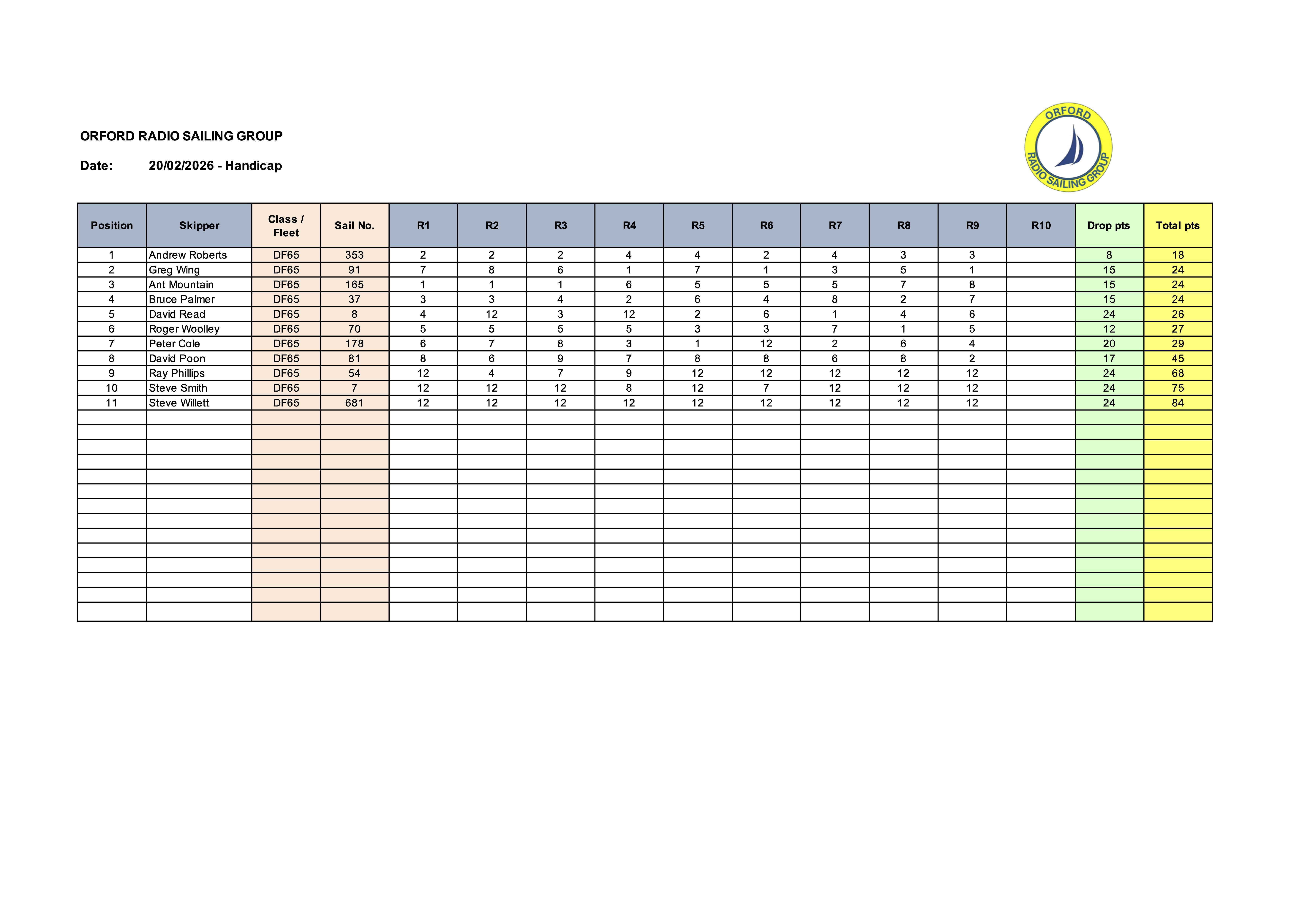 Twelve skippers enjoyed fine conditions at the Pond again today. We had a nice steady breeze – perfect for these boats, predominately north to north easterly enabling 9 three lap races to be completed. Thanks to Bruce, Ant and David for their input into setting our courses. Just about everyone enjoyed them, bravo! Andrew won overall honours with very consistent results. He was followed by our most improved Greg and Ant (both with 3 wins). Interesting to note only 5 points separated 2nd place to 7th highlighting the competitive nature of our racing. Well done all. We also welcomed a newcomer Stephen Smith (not the cricketer) who contacted David after seeing the notice in the Post Office window. Hope you enjoyed the outing Stephen. Scratch racing next Friday guys being the last Friday of the month and also the summer sadly. Cheers Pete.