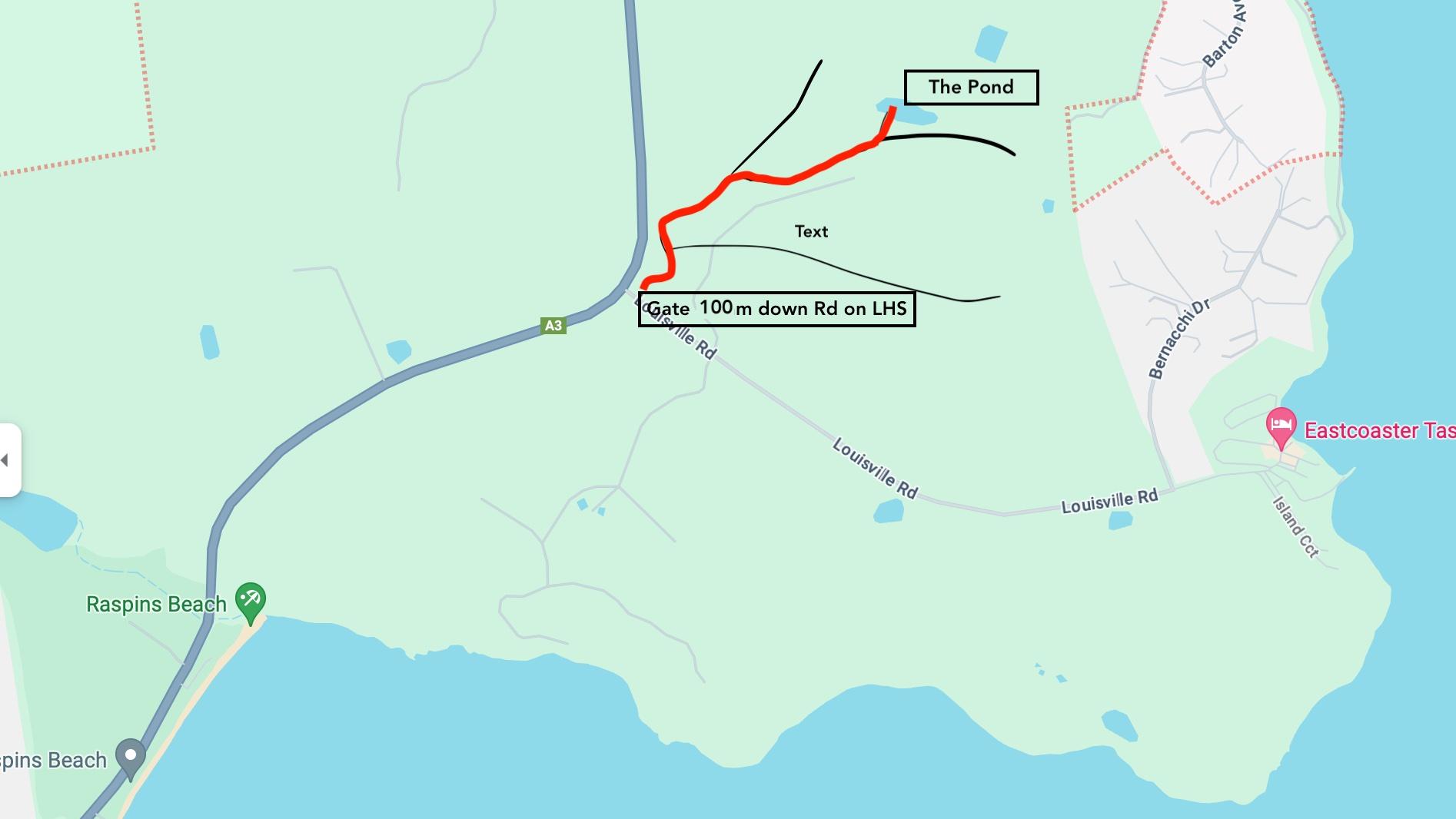 Access to the Pond is from Louisville Road between Orford and Triabunna – see the map attached for details.