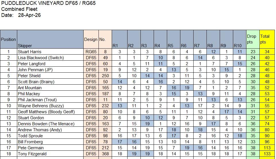 Another good day at the Duck with the usual variable wind, mostly NW(ish) and lots of highs and lows. A fleet of 18 sailors made for some challenging situations around the marks, but in spite of some unavoidable collisions and a bit of mild barging, it all went pretty well for such a large fleet. Stuart came out on top with his RG in spite of him giving himself a 30 second handicap from the beginning. The first DF65 was Lisa Blackwood followed by Peter Langford and John Penman. Well done guys. The close racing resulted in 14 sailors getting into the placings throughout the morning and a long list of handicaps being read outas the morning progressed. Special mention must go to Sue and Graeme as the close finishes make it tough keeping the scoresheet correct. Well done again you two. Cheers DB