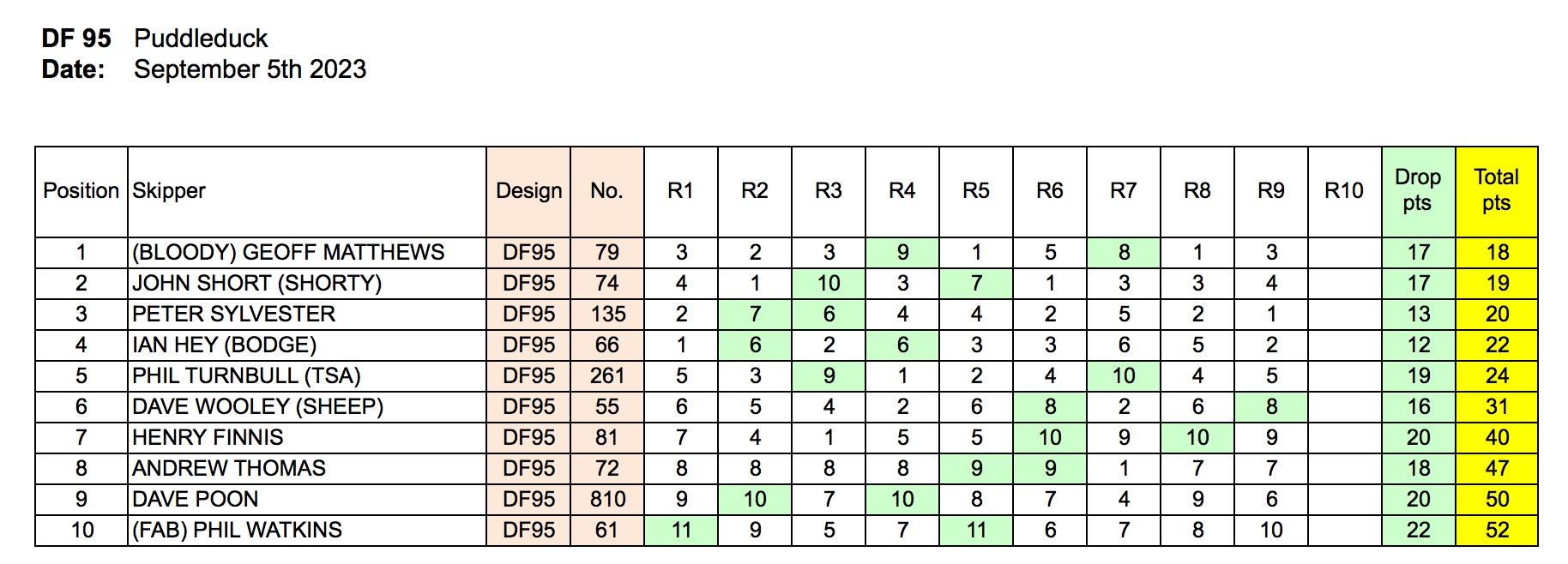 Only 6 points separating the top 5 skippers today. Pete Sylvester took third spot on the podium. It has been a while since Pete has made it to Puddleduck and it was great to see him today. I took second place with two race wins on the scorecard. It was (Bloody) Geoff Matthews who took out the day just one point ahead. Well sailed Geoff! Geoff’s win today follows a second overall in our last DF95 event. You are throwings down a bit of a gauntlet Geoff.
