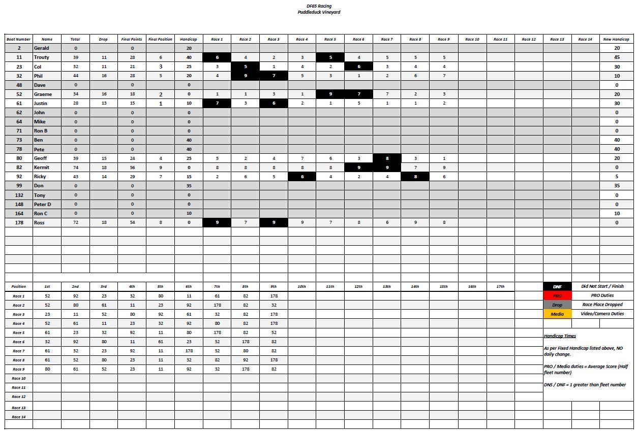 Kermit on 56 points, Ross on 54, Ricky on 29, Trouty on 28, Phil on 28 (countback), Geoff on 24, Admiral on 21, Graeme on 18 and our winner this week Justin on 15 points.