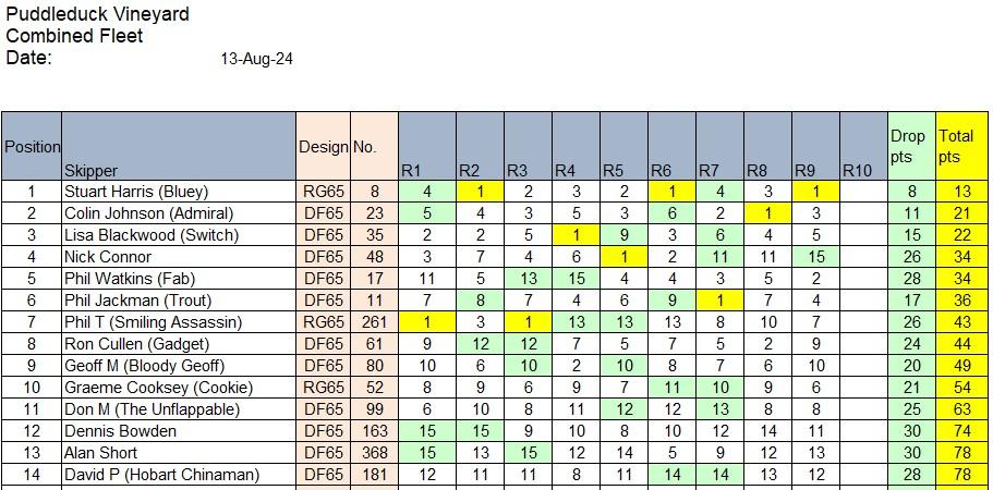 Once again, well done Bluey for first position in the combined fleet. He only dropped eight points, consisting of two fours, leaving him a total of 13 points, way ahead of the rest of the fleet.