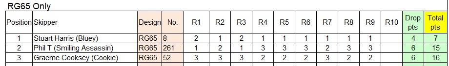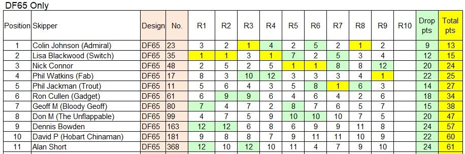 The usual results in this class except for the addition of the DF95 which helps the spreadsheet to filter this boat out of the DF65 results.