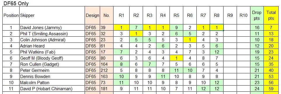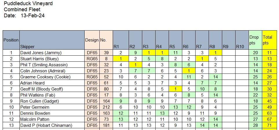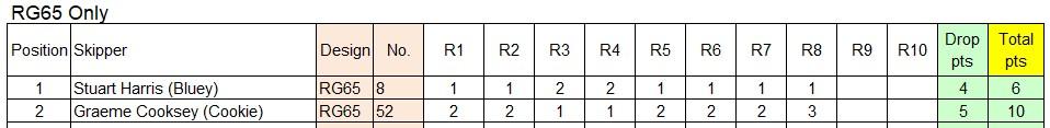 Close racing at the pointy end of the fleet saw Jammy taking first position in the combined fleet and DF65 class with 11 points and 7 points respectively. Bluey sailing his RG65 came second in the combined fleet on 13 points. The Smiling Assassin came second in the DF65 class on 13 points followed by The Admiral in third on 18 points. Well done to our podium placings today.