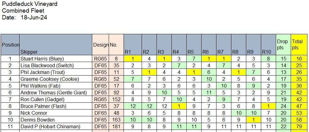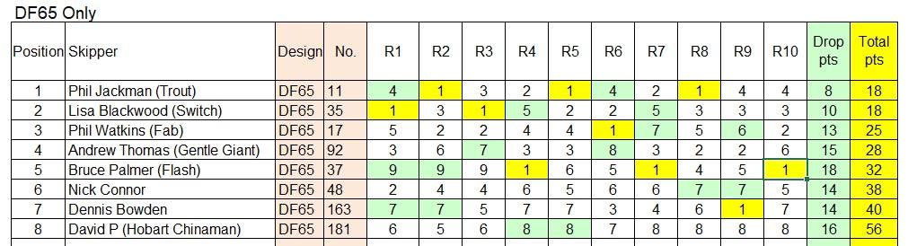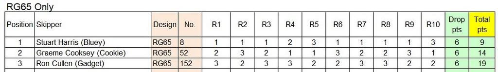 Taking the RG65’s out of the mix, winner of the DF65 only class goes to Trout with Lisa second. Both being on 18 total points after drops. We trust the magic of the XL spreadsheet to work out the countbacks! Third place goes to Fab on 25 points.