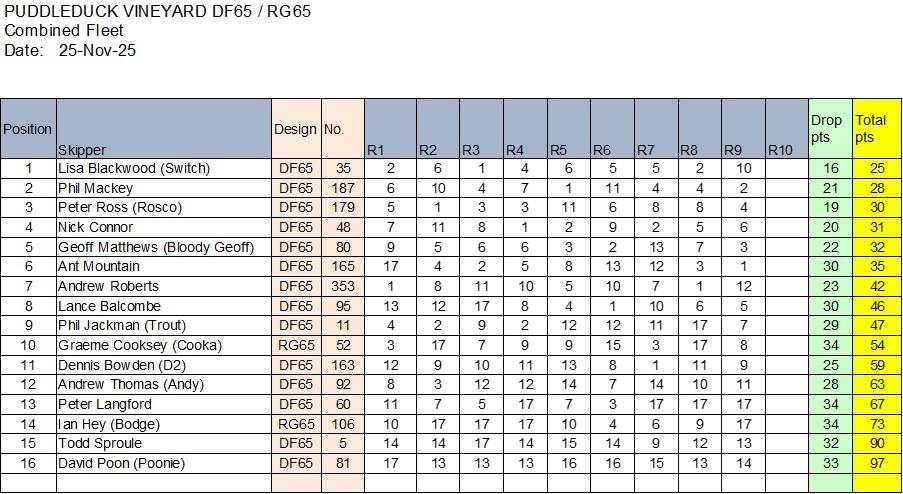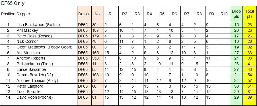 Nine races were completed today, and it was Switch that came away with both the combined and DF65 only class wins on 25 and 23pts respectively. Second was Phil Mackey 3ptrs adrift in both classes, Rosco taking the final podium spot by 2 pts in the combined class, but was tied for 2nd place in the DFonly class with Phil, but Phil maintained 2nd on countback. Hot on their sterns were Nick (Putty), Bloody Geoff, and Ant Mountain. Cooka cleaned up in the RG class …. Well sailed by all skippers today.