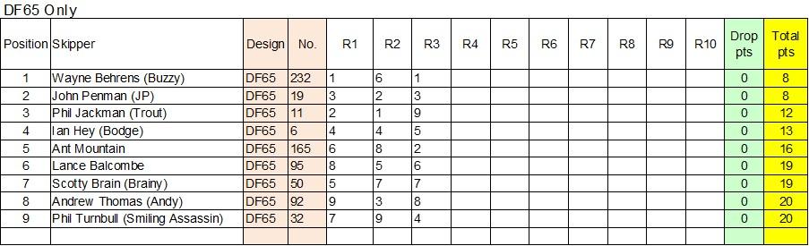 JP came out on top in the combined fleet with two x 3rd places and one 2nd place with only 1 point seperating him from Buzzy. In the DF only results it was Buzzy on countback with JP closely followed by Trout. Well sailed chaps.