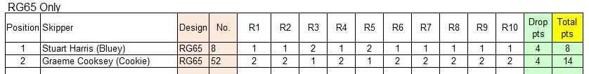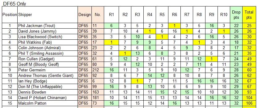 First position in the DF65 class goes to Trout. Great sailing again considering he had a DNS for race 9 to rescue his boat from the jaws of mega duck over near the BBQ area. This was because he was assisting Sue with scoring in race 8 and his boat decided to go for a wander.
