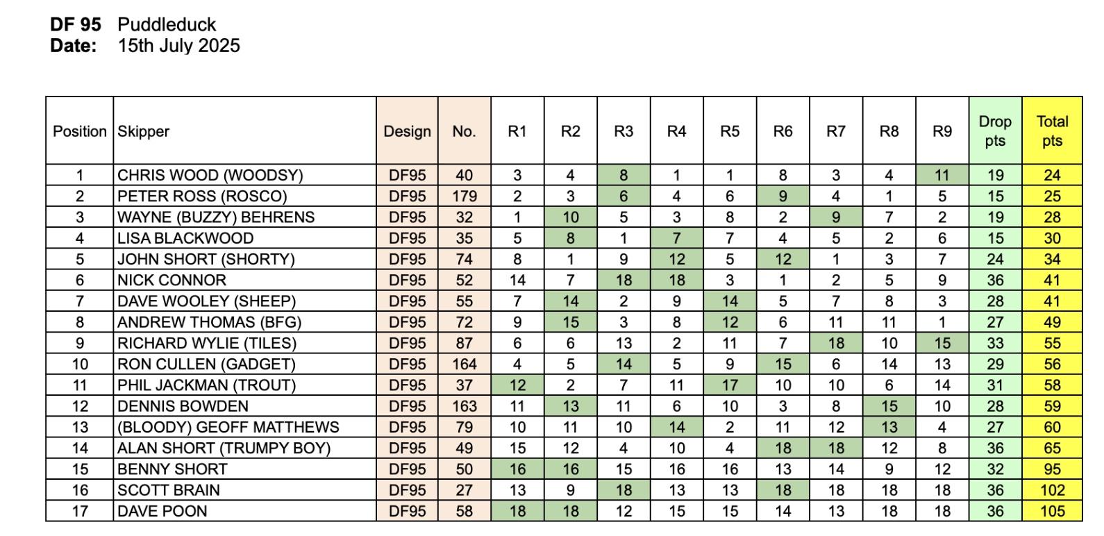 Seventeen skippers is just about a record for DF95’s at Puddleduck and with the wind frequently propelling the rear of the fleet towards the front the close racing gave the dam a crowded feel. Keeping out of the way of others was harder than normal as wind shifts of 90 degrees frequently turned good clearance into unavoidable contact. Still it was those skippers who steered a wide birth around trouble that did well.